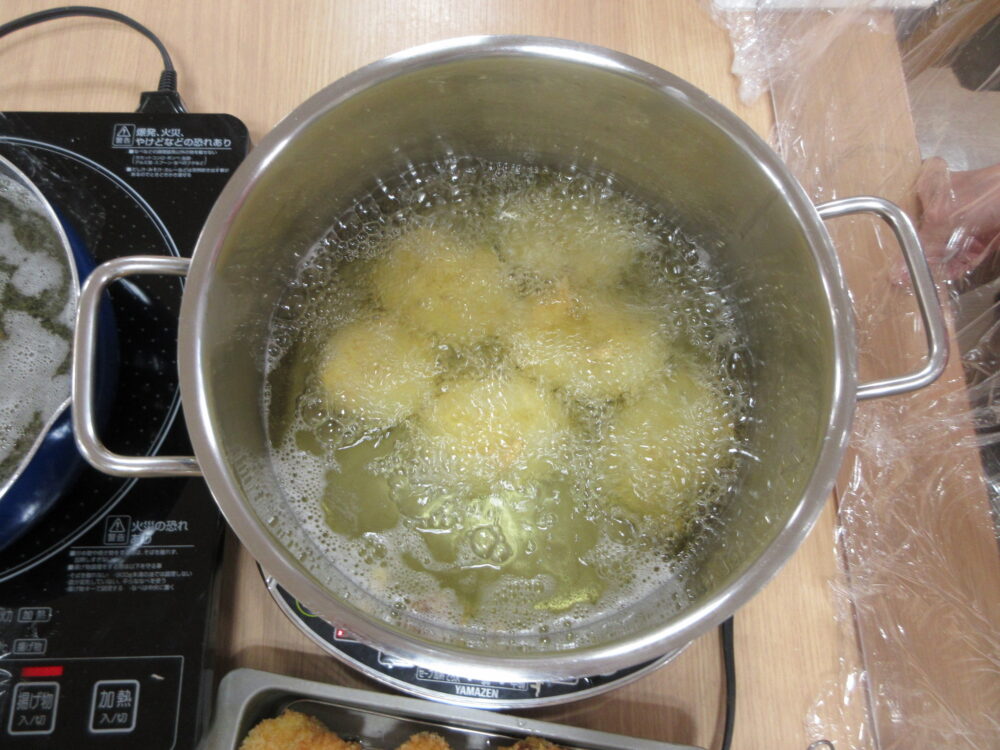 コロッケ作りは工程がたくさんあるため、朝から職員とお客様で協力し合いながら作りました。お客様の日常生活動作に合わせて作業を分担し、進めていきました。料理作りは、五感を刺激するだけでなく、楽しみながらリハビリに自然と繋がっていることが魅力の1つです。家庭の味を思い出し、子育てをしていた頃を懐かしんでいただきました。「料理は愛情」と言いますが、会話も弾み愛情を感じるコロッケ作りとなりました。