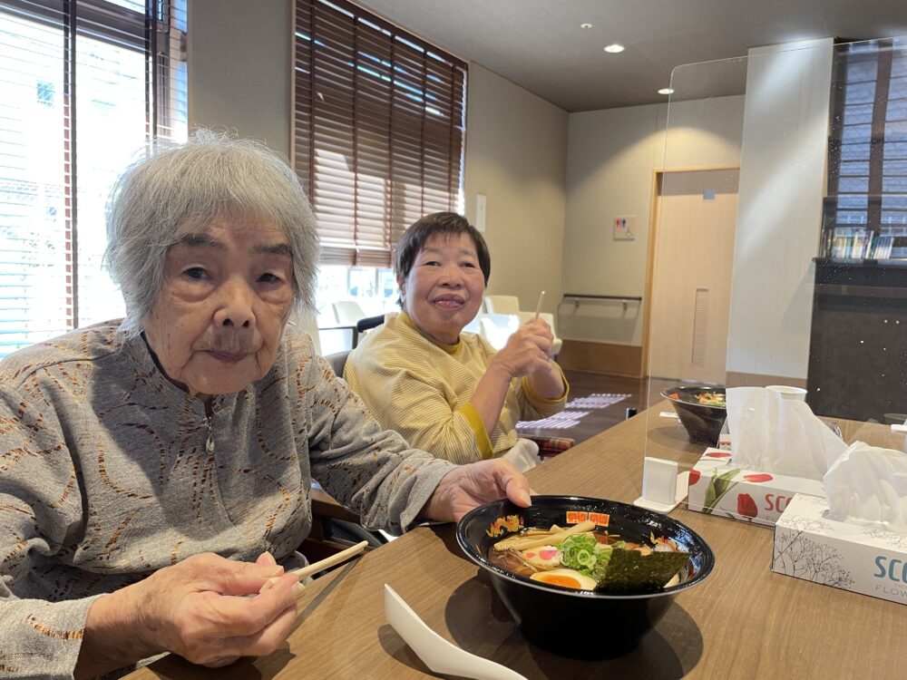 「去年食べたラーメンが忘れらない」「もう一度食べたい」「あの美味しいラーメンだったら何杯でも食べれる」「また呼んでほしい」と、多くのお客様からリクエストいただき、再び実現したラーメンイベントは、今年も大好評でした。フロア中にスープの良い香りが漂い、お客様や職員の五感を刺激し、いつも以上に食欲が増し大満足の昼食になりました。