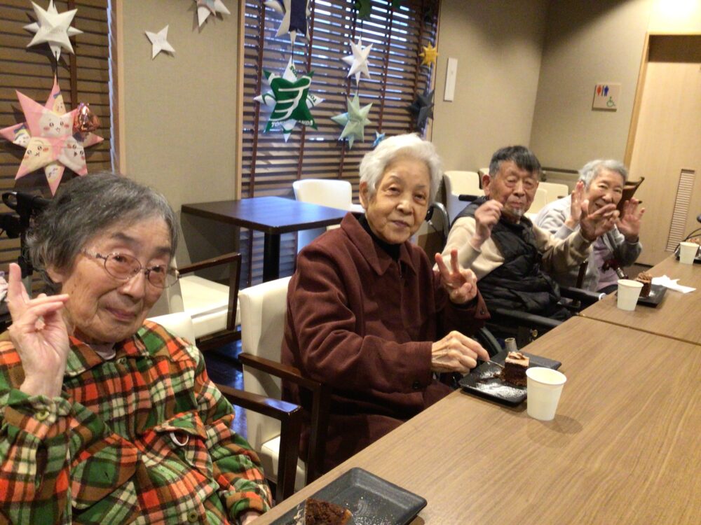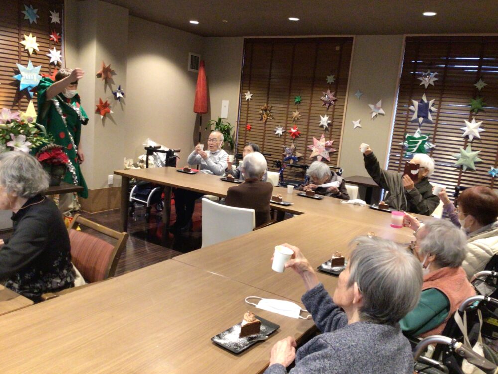 「メリークリスマス、乾杯!」と皆様元気よくご唱和いただきケーキを召し上がっていただきました。地元のケーキ屋さんにご協力いただき、どなたでも召し上がりやすいケーキをご用意させていただきました。皆様「フワフワだね」「美味しい」ととても喜んで下さいました。