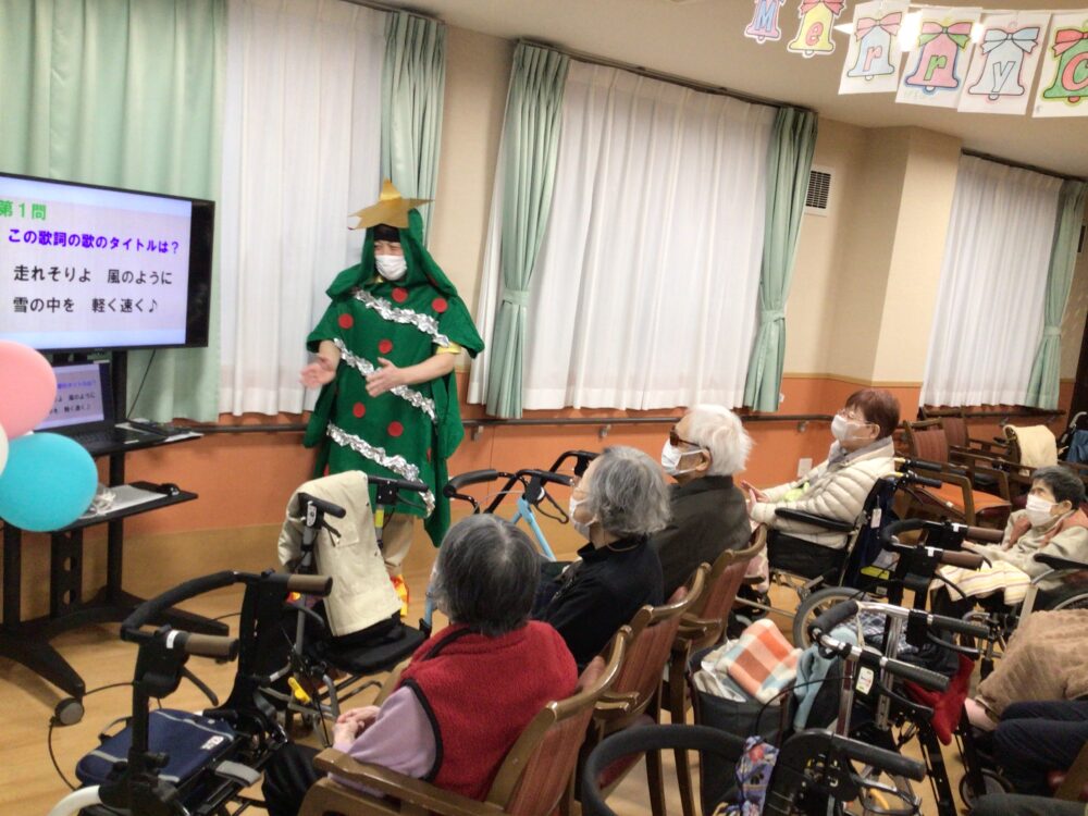 クリスマスの余興としてクリスマスの歌クイズを行いました。クリスマスの歌の歌詞をテレビ画面に映し出し、曲のタイトルを当てていただいたり、その曲にまつわるエピソード等をお話させていただきました。そして最後はクリスマスの歌を全員で合唱しました。