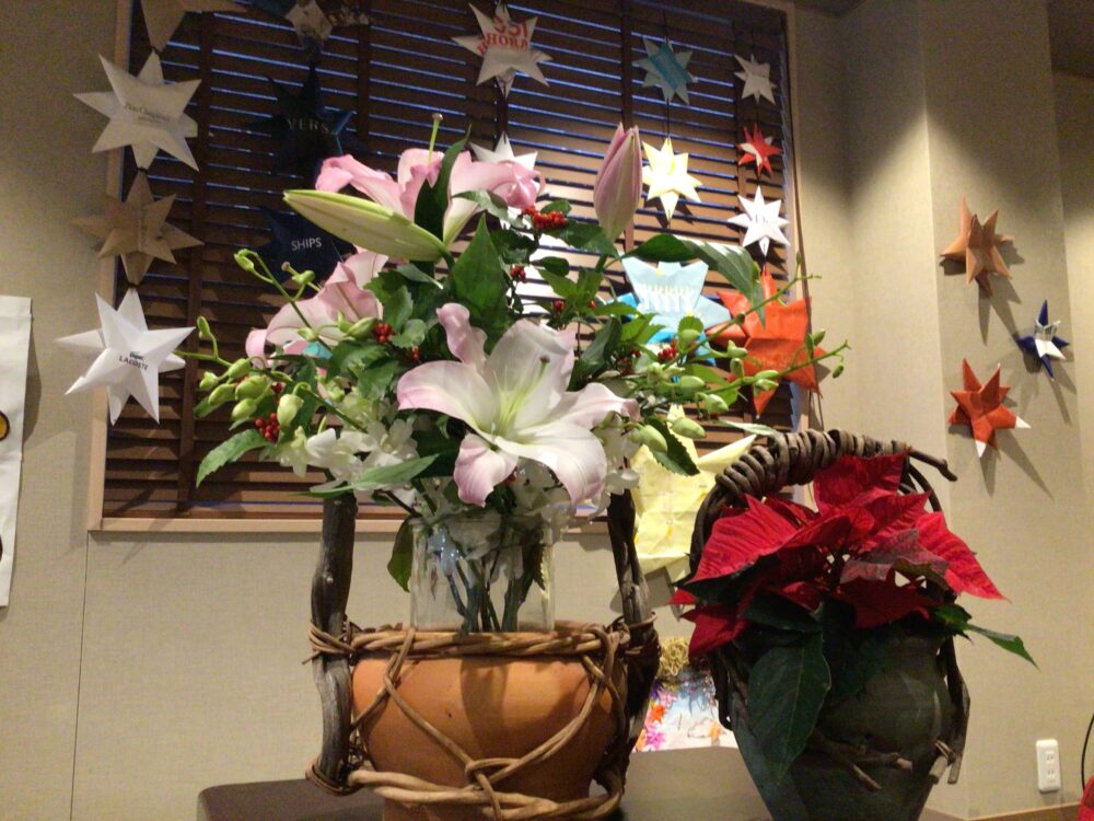 お客様にクリスマスの雰囲気を味わっていただけるよう花水木の壁面にサンタクロース、ソリ、リース、雪だるま等のイラストや星の飾り付けをしました。お客様が部屋に入ると「わあ、綺麗ね」と喜んで下さいました。