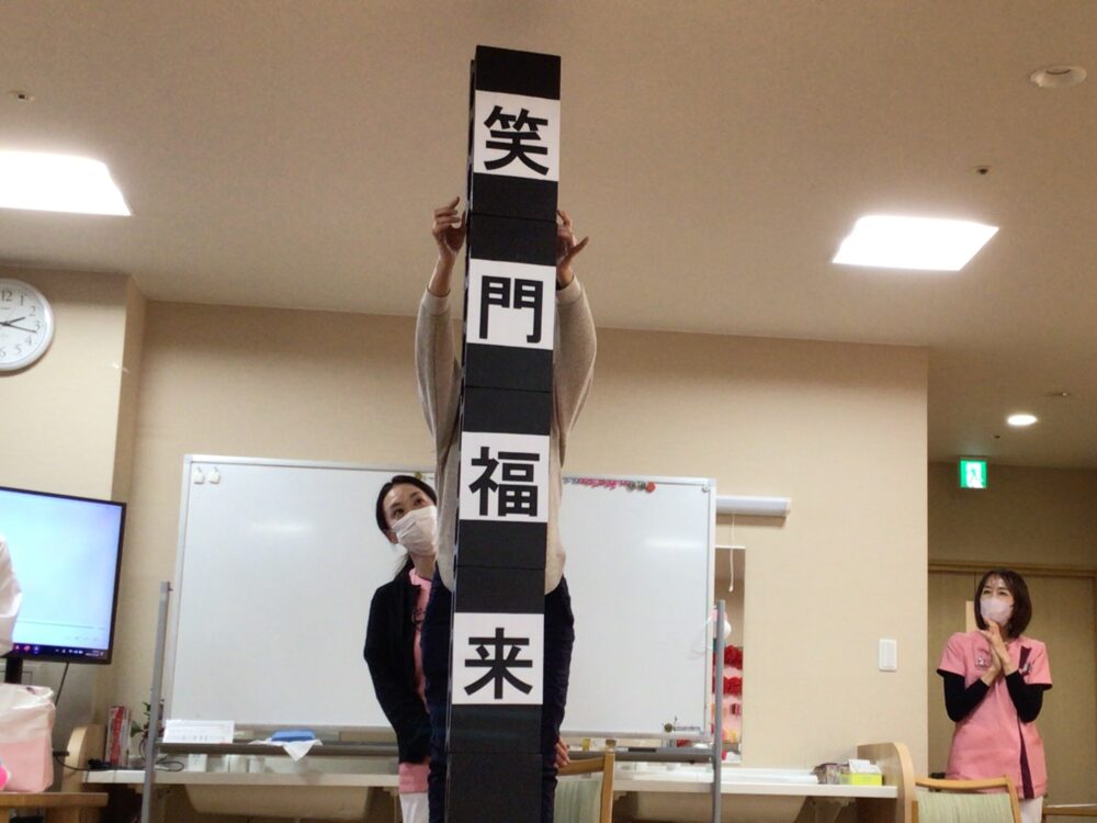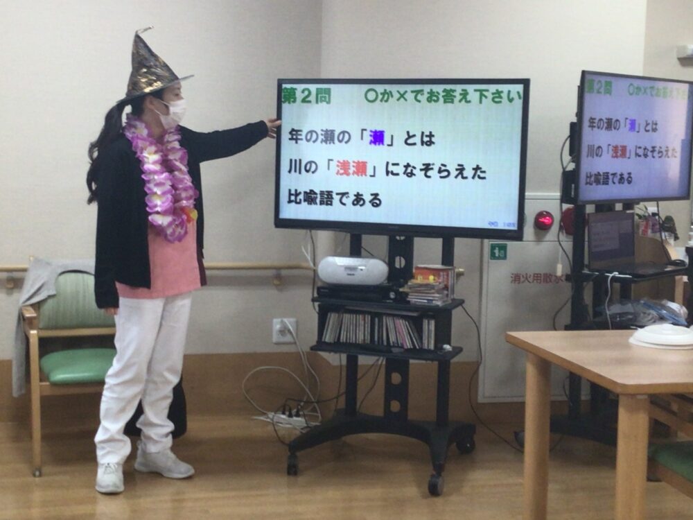 年の瀬にまつわるクイズを画面に映し出します。問題の解答は「〇」「×」の2択制となっております。お客様には「〇」「×」プレートにて回答していただきました。司会はナースの2人です。「年の瀬ガールズ」というステージネームで楽しく進行しました。