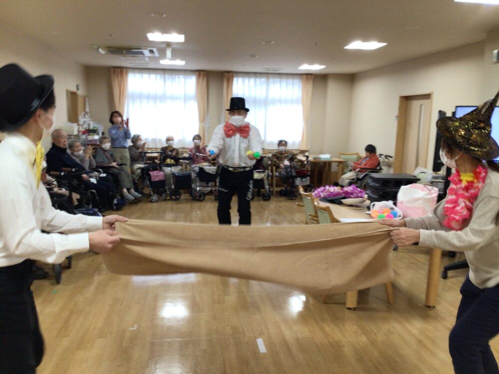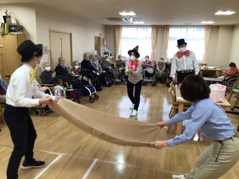 職員2名でタオルを広げます。別の職員1名がボールを投げます。職員2名が息を合わせボールをキャッチします。投げる距離を遠くしたり、ボールの数を増やし徐々に難易度を上げていきました。時折お客様にもボールを投げる役に参加していただきました。