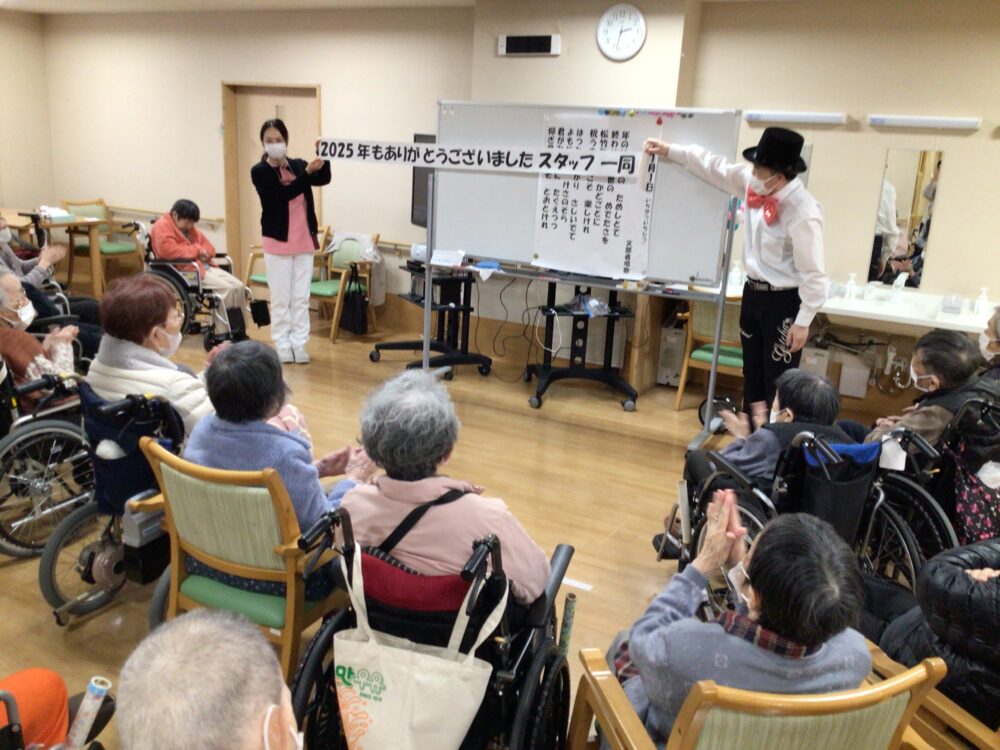 全員で「1月1日」を合唱しました。皆様歌が大好きで元気よく歌っていただきました。歌の後に「2025年もありがとうございました スタッフ一同」の幕を披露させていただくとお客様より大きな拍手をいただきました。