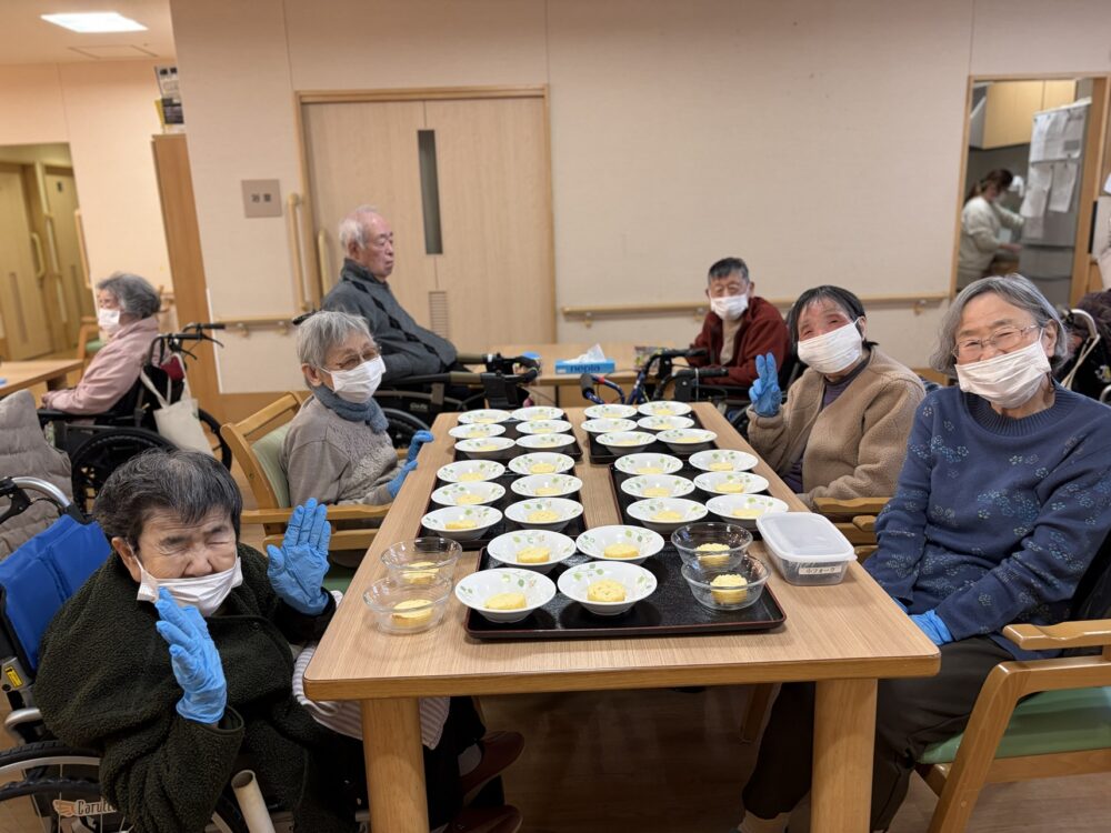 今回は、「ご高齢の方でも気軽に召し上がっていただけるやわらかおやつ」というテーマで企画させていただきました。日頃食が細いお客様も喜んで召し上がっておられとても嬉しく感じました。ケーキ作りの作業に関して、職員からおやつ作りについて説明させていただくと、同じテーブルのお客様同士で話し合い、役割分担をされたり素晴らしいチームワークで進めておられました。お客様が目にしたことがない材料等を使用することにより好奇心が沸き、新たな刺激を感じていただけたのではと思っています。また、分量に注意する場面等もありましたが、作業を進めながら調整されたりと、お客様が手と頭を動かすことにより生活リハビリの要素を取り入れることができました。お客様がとても楽しそうにされている姿を見て私自身励みになりました。