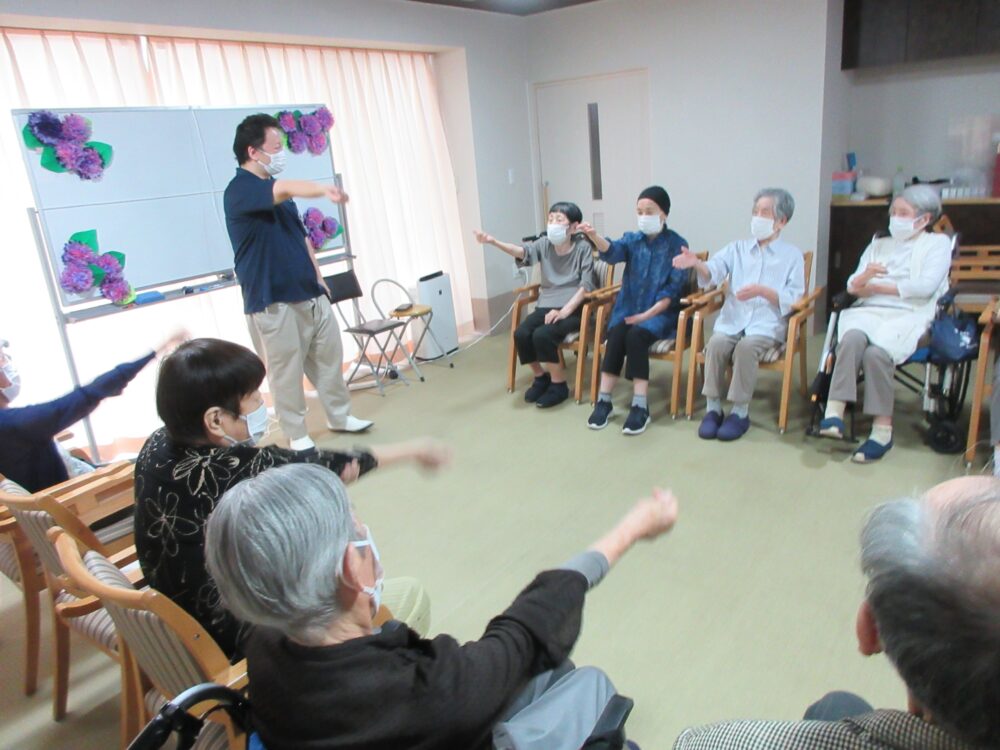旗揚げゲームと玉入れゲームを行い、皆様にしっかりと体を動かしていただいた事で、良い気分転換になったのではないかと思います。その後のフレッシュジュースも皆様「美味しいよ」と沢山飲まれており、脱水の予防として水分補給をしっかりと出来たので良かったです。てるてる坊主の作成や紫陽花の飾り付け等もお客様に行っていただけた事で、職員とお客様一体となって取り組むことが出来たレクリエーションとなりました。