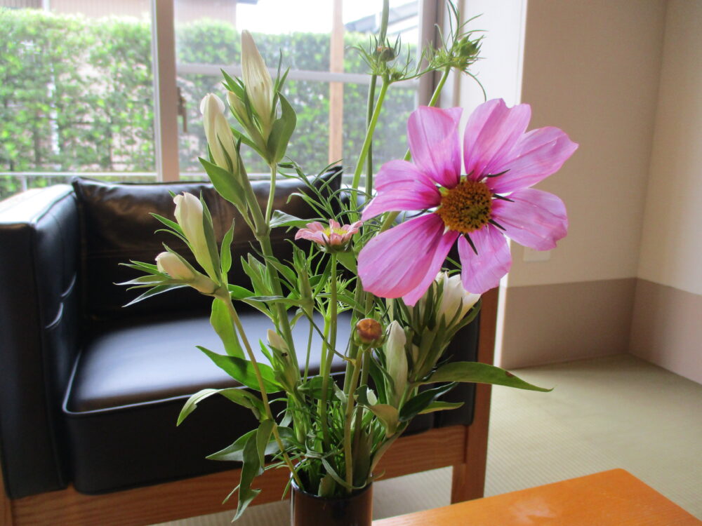 9月のお花として有名な、コスモスをご用意しました。ピンク色の立派なコスモスと、白色のリンドウを飾り、「リンドウと言えば青色だけど、白いリンドウは珍しいね」とお客様も驚かれました。