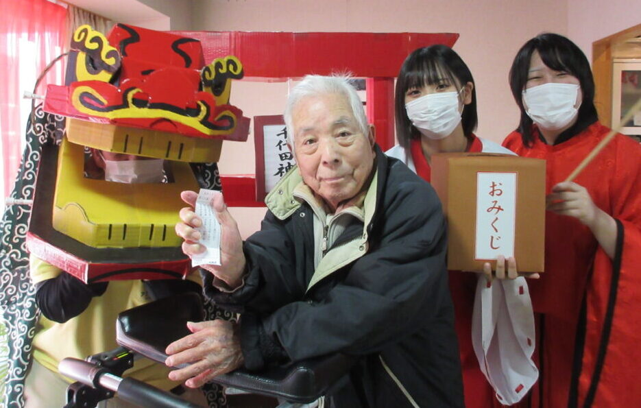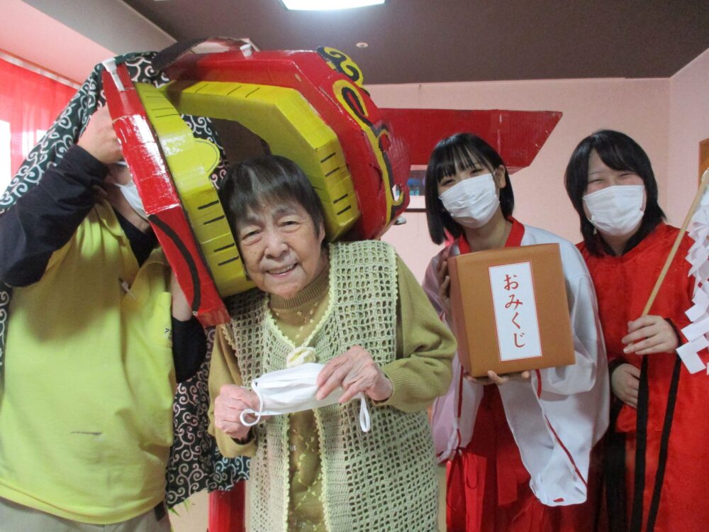 今年もお賽銭箱とおみくじ掛けを作成し、より現実の神社に近づける事で施設にいながら初詣の雰囲気を味わい、楽しんでいただけたと思います。お客様の笑顔も沢山見る事ができました。また、おしるこも好評で「美味しいよ」「また作ってね」とのお声をいただき、大変喜んでいただけました。