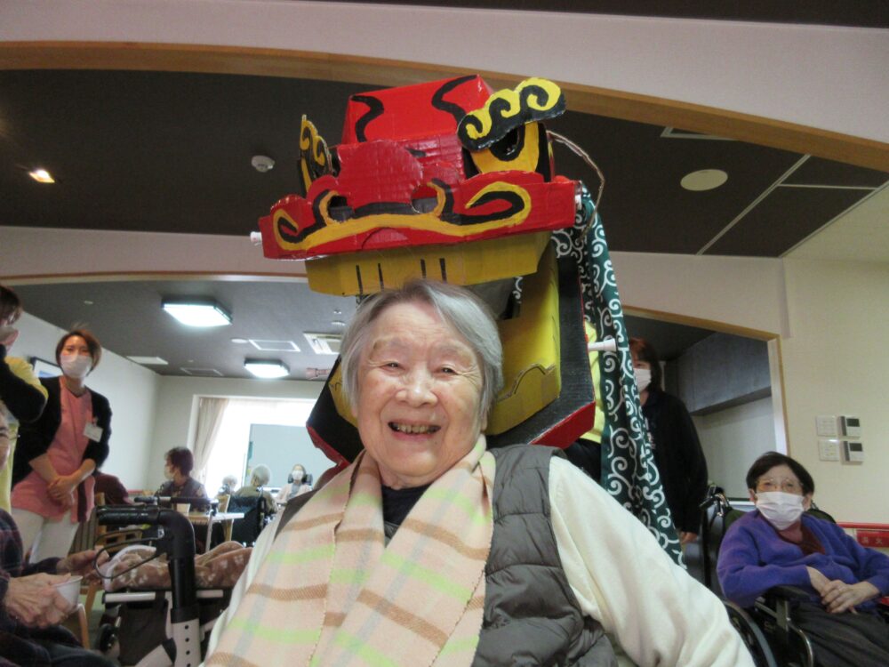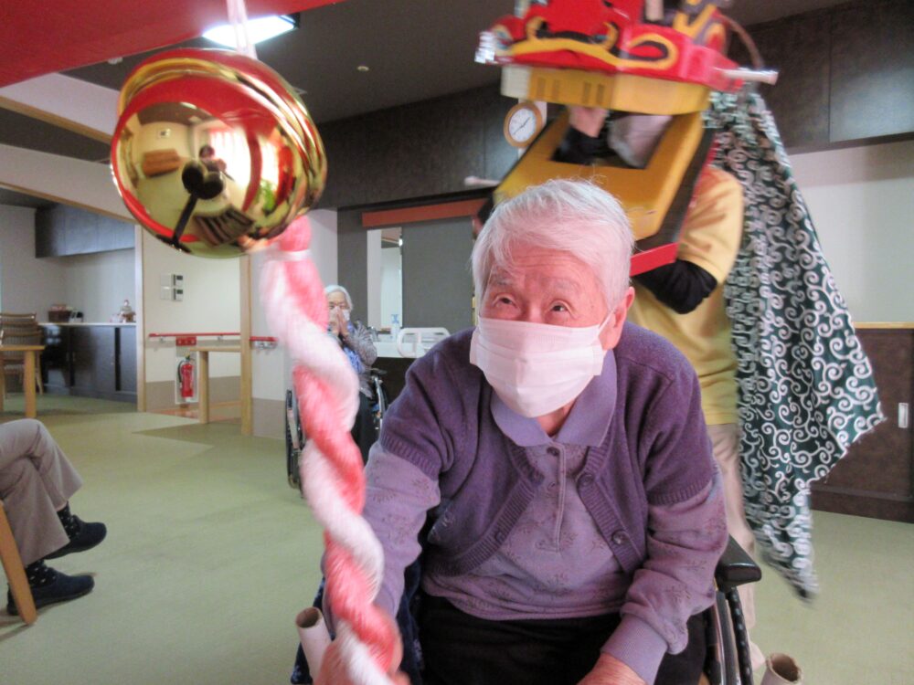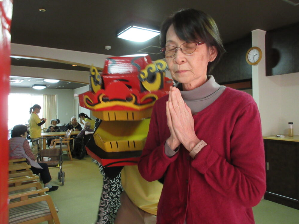 新年を迎え、当施設ではお客様と一緒に施設内で初詣を行いました。今年も手作りの鳥居・お賽銭箱・獅子舞が大活躍しました。