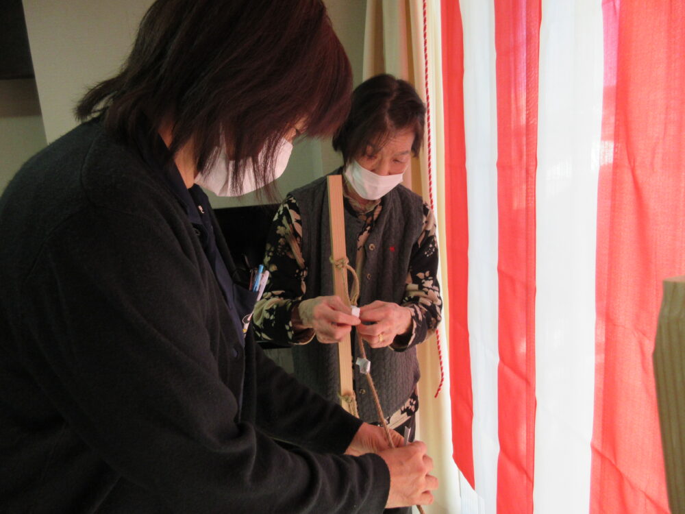おみくじ掛けにおみくじを括り付けていただきました。千切れてしまわないよう慎重に結んでいただくことで、指先の運動にもなりました。