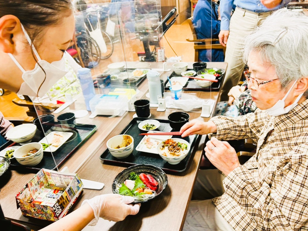 今月のイベント食は、お客様が大好きなお刺身の盛り合わせを提供させていただきました。南鮪の赤身、油の乗ったカンパチとサーモン、さらに青のりを添えて豪華な盛り合わせとなり、新鮮な海の幸にお客様にも大変喜んでいただくことができました。また次回の開催を望むお声もたくさん聞かれ、お客様のご希望に添う形で定期的に提供を続けて行けたらと思います。季節の物や新鮮な物にお客様の笑顔をたくさん見ることが出来ました。これからもお客様が笑顔で過ごせる時間を提供していきたいと思います。
