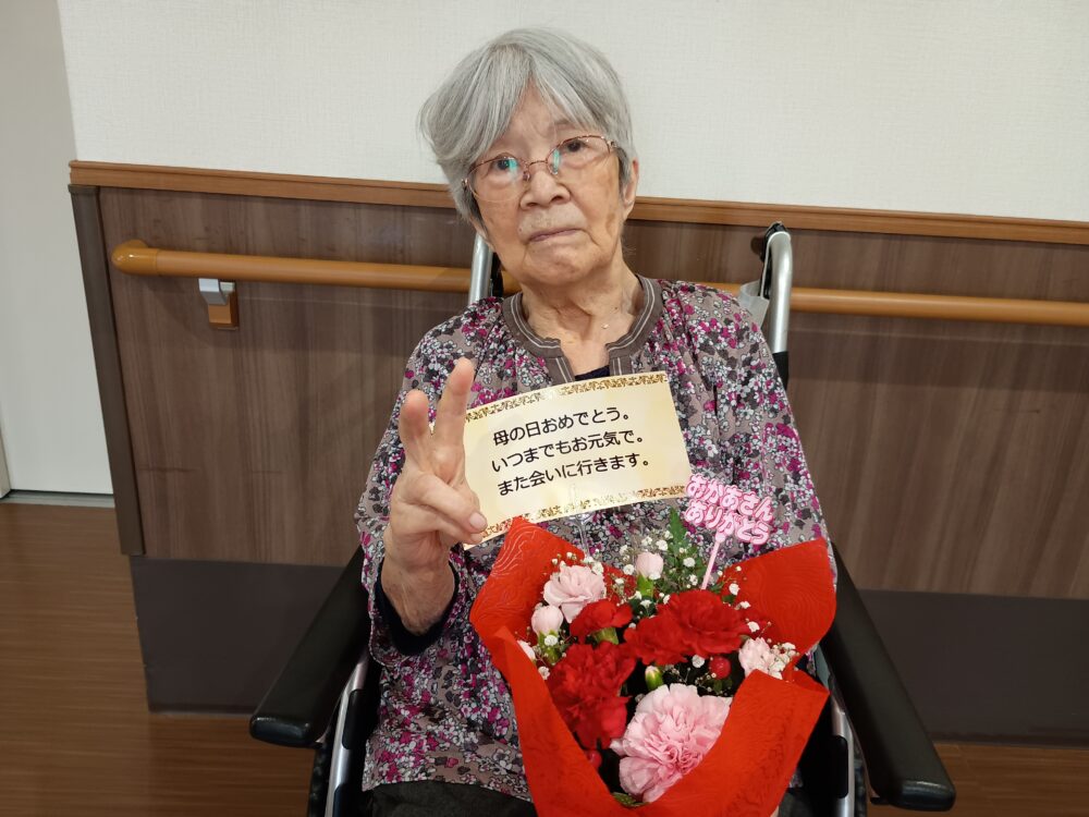 5月は母の日ということで、感謝の気持ちを込めたお花だけでなく、プレゼントを持参してご来所されたご家族様もいらっしゃいました。日頃ご多忙でなかなか面会に来られないご家族様も、お花を通じて感謝のお気持ちを伝えることができたように感じております。職員からも感謝の言葉をお伝えしましたが、ご家族様のお気持ちを受け取った際のお客様の笑顔が、何より印象的でした。今後も、お客様に笑顔になっていただけるような活動を企画してまいります。