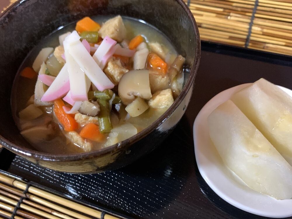 「のっぺい汁っていうんだ。初めて食べる。これはうまい!!食べすぎちゃうね。」