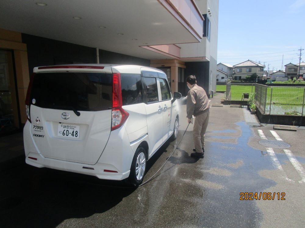 職員が見守る中、社用車の洗車にも挑戦しました。