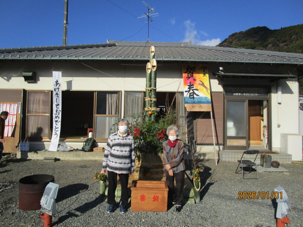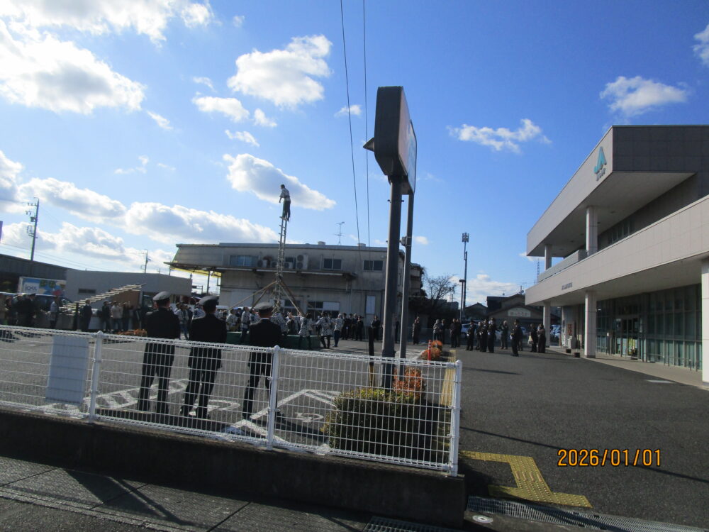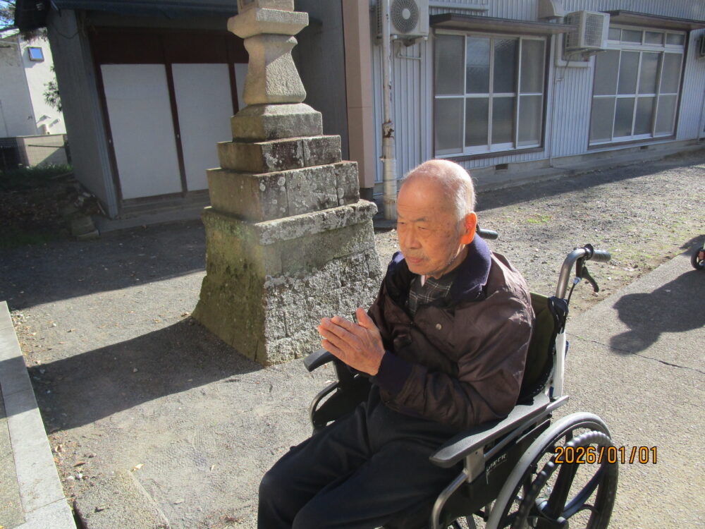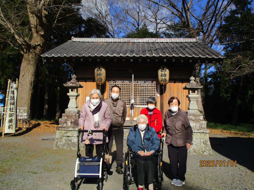 静岡市清水区にあるハートライフ押切では「令和8年元旦」 施設長より新年のあいさつの後、毎年恒例 元旦・押切八幡神社に「初詣」に行ってきました。「初詣」の後は清水区鳥坂自治会館前にある大きな「門松」を見て正月気分を味わいました。