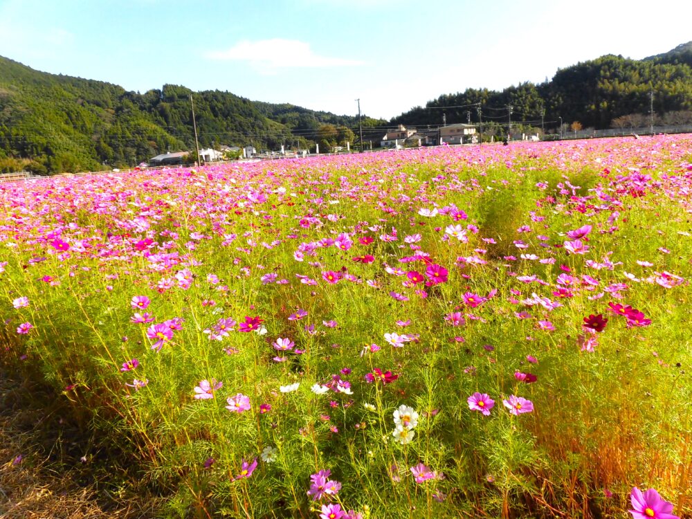 コスモス畑は藤枝市岡部町殿地区にあります。ここでは毎年、住民有志のグループが休耕田に種を蒔きコスモスを栽培しているそうです。約3haもの休耕田に植えられたコスモスは視界一面に赤やピンクのかれんな花が咲き揃い、高く広がる青空と周囲の緑の山々とのコントラストも合わせてとても素敵です。