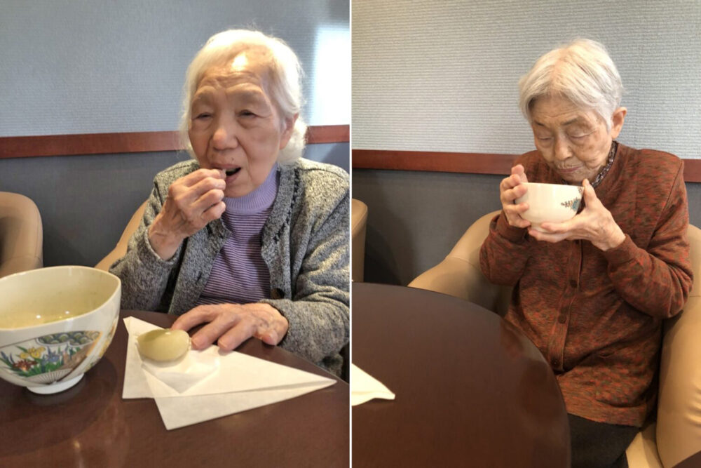 施設内にある喫茶スペースにて実施しました。12月の掛け軸やお花を用意しお茶を点てる職員は作務衣を着て行いました。参加されたお客様の中には以前お茶を習っていた方がいらっしゃり、掛け軸や茶器の話をしてくださり昔の事を思い出されわびさびを感じていただけたと思います。