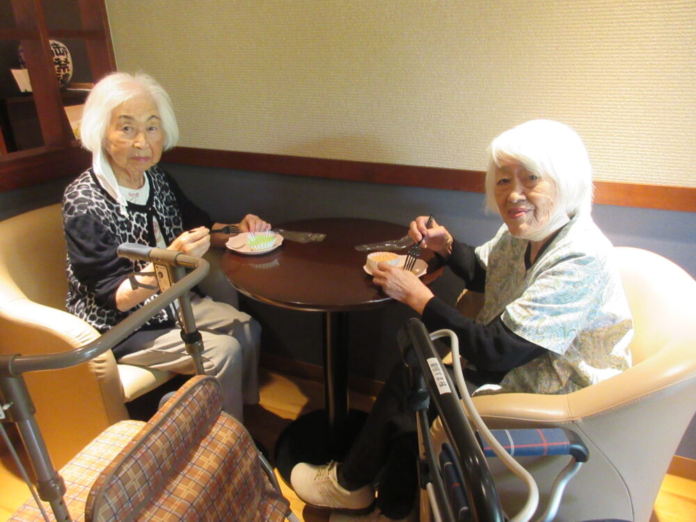 普段の食事中にお客様から「生のフルーツが食べたい」「旬のものが食べたい」というリクエストがあり、「食欲の秋だから、美味しいフルーツを食べていただこう」とフルーツの会を企画しました。施設の食事でも生のフルーツが出ることはありますが、このように色々な種類を一度に召し上がることはないので、皆様とても喜んでくださいました。フレーバーティーも好評でした。旬の物を食べると免疫力が向上すると言われています。皆様の元気の源になればと思います。