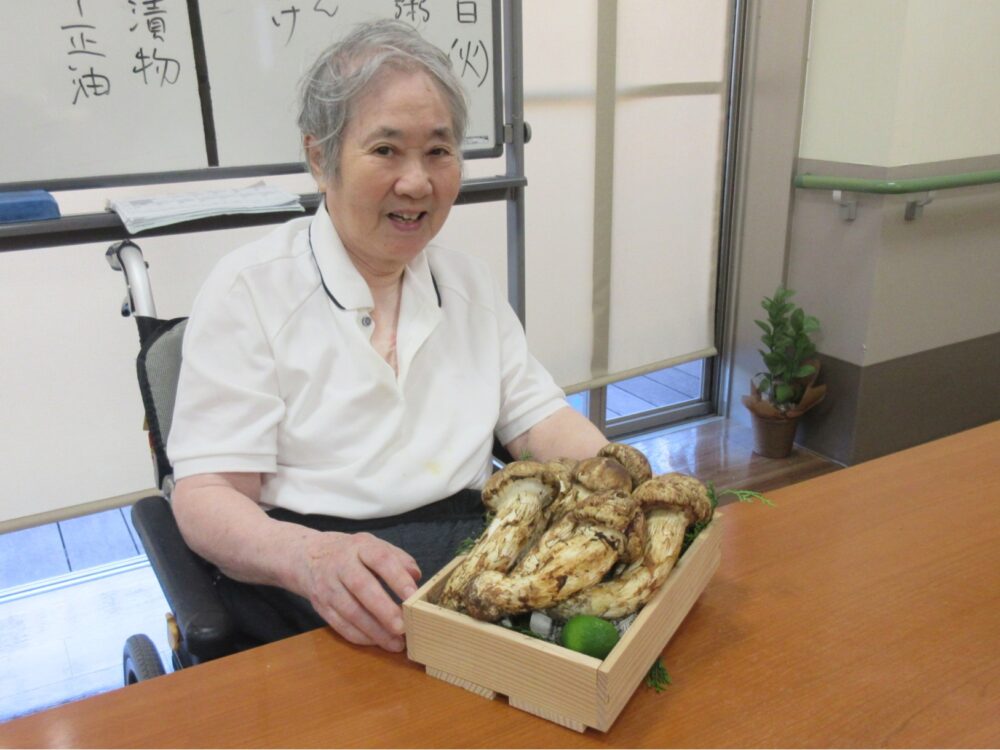 今回は五感を使って秋を楽しんでいただきました。調理前に視覚で楽しんでいただき、調理後は嗅覚や味覚で楽しんでいただきました。まつたけの箱を持ってみて、意外な重量感に驚いている方もいらっしゃいました。今後とも施設内イベントや外出などで、全身で季節を味わっていただけるよう企画してまいります。