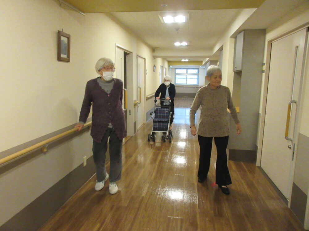 毎日の食後とレクリエーションの後はお散歩の時間です。仲のいいお客様と連れ合って館内散歩に出発します。