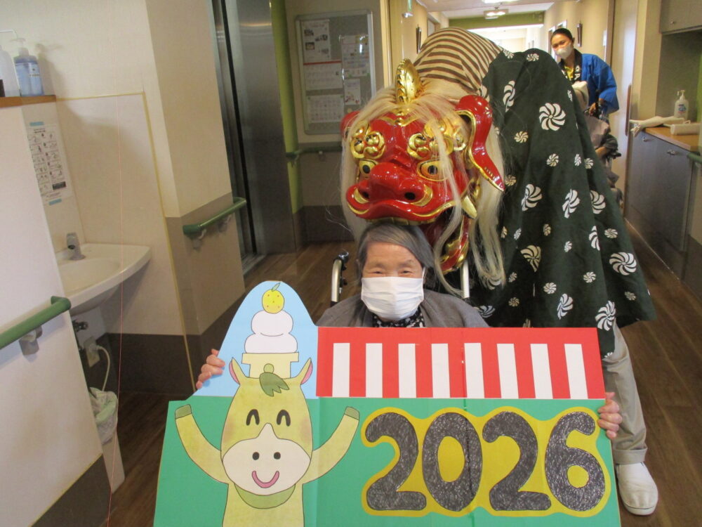 毎年恒例となりつつある「獅子舞」。今年は2026年と分かるように看板を作り、記念撮影しました。重い獅子舞は被るだけでも大変ですが、お客様の目線に合わせてふれ合うのは、体力的に大変だったようです。それでもお客様の笑顔に引っ張られて頑張ってくれた職員に拍手です。