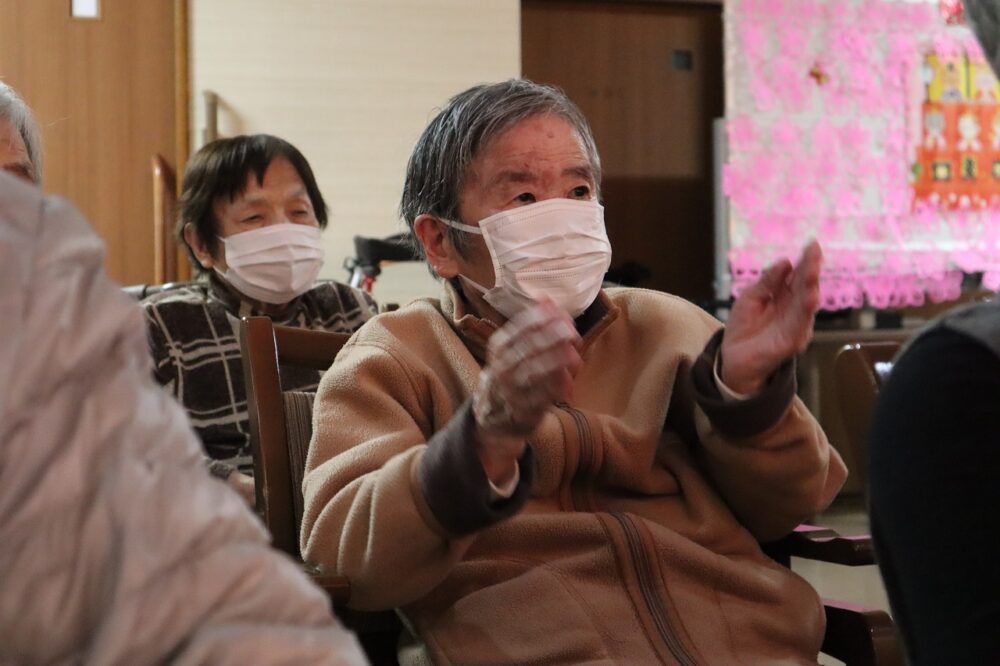 プレミアムハートライフ大岩では、今年のひな祭りイベントは「みんなで歌う」をテーマにお客様の知っている曲を中心にコンサートという形で実施いたしました。桃の節句の飾り付けと華やかな照明を施したなかで職員のギターによる演奏が始まります。お客様が自然と手拍子を始めて歌いだし、気が付くとみんなで声を出し笑顔で歌っている。そんな素敵なひな祭りイベントとなりました。