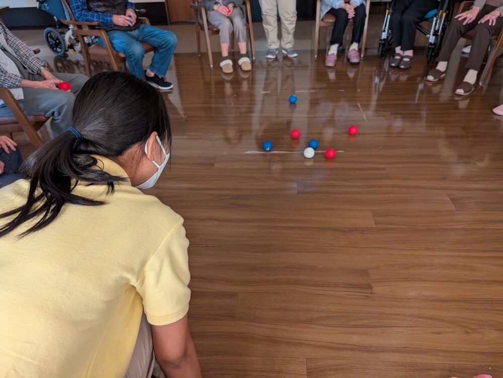 今回は沢山のご利用者様が一緒に楽しめるよう赤と青のチームに分かれ、輪をつくり対戦形式で行ってみました。ボールは適度な重さがありますが、ご利用者様でも簡単に投げることができました。3回目くらいにはコツをおぼえて白いボール(目標とする玉)にぴったりと近づけることができるご利用者様もいらっしゃいました。