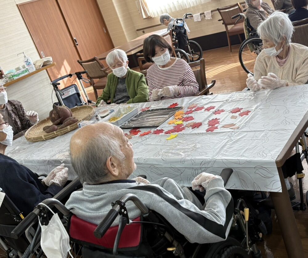 プレミアムハートライフ大岩では、お客様に秋の味覚を存分に楽しんでいただきたいという思いから、職員同士で意見を出し合い、旬のさつま芋を使った茶巾絞り作りをお客様と一緒に行いました。