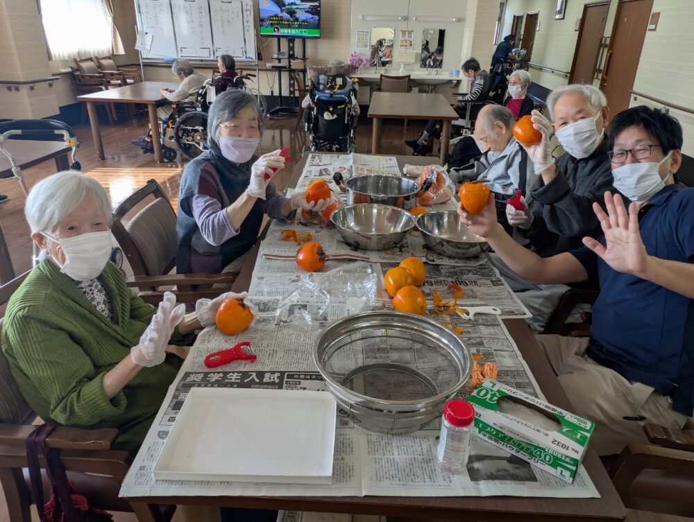 プレミアムハートライフ大岩では、11月に入り毎年恒例の干し柿づくりを実施いたしました。秋の季節を感じていただけるよう、皮むきから紐に吊るす作業までを皆さまに楽しんでいただきました。今年は、山梨県産の大きな渋柿をご用意させていただき、その見た目や重さに驚かれる方も多くいらっしゃいました。12月に入る頃には、柔らかく甘みのある干し柿が出来上がる予定で、皆さま楽しみにしておられます。