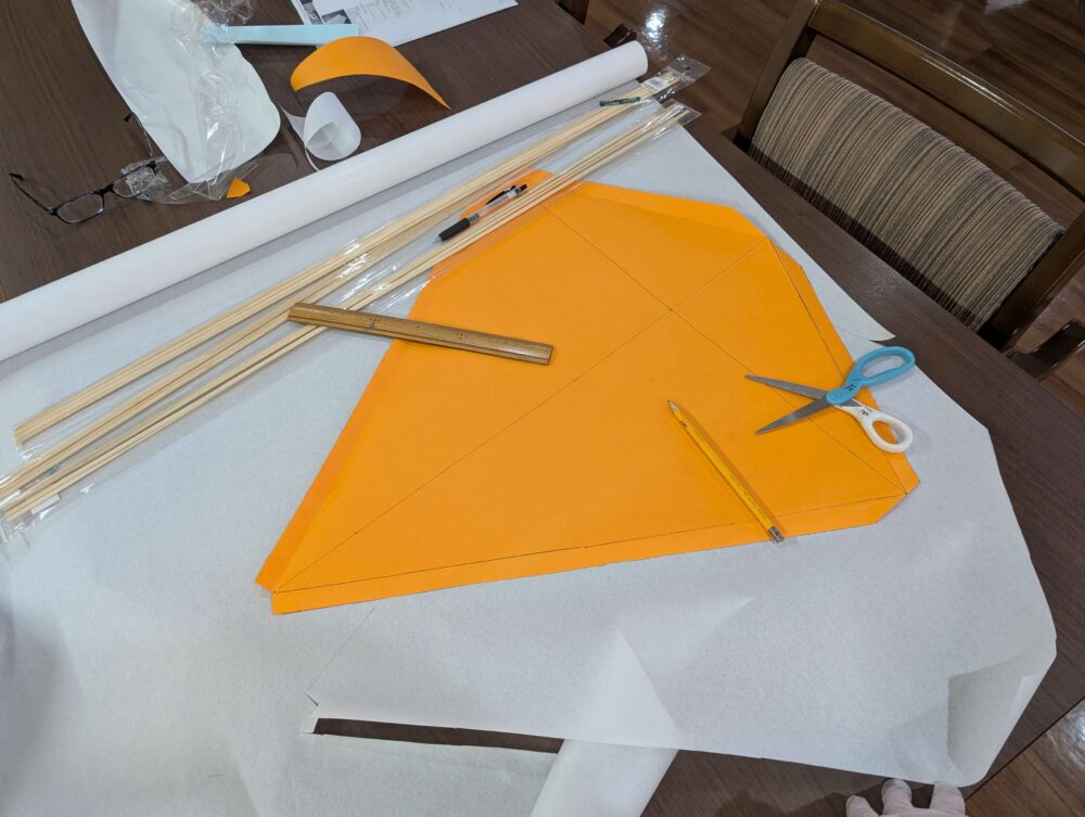 和紙は障子紙を使用して造りもシンプルな菱形のダイヤ凧を作ることにしました。男性のご利用者様は幼少期に凧作りは皆様経験されているようで、いろいろアドバイスをいただきました。