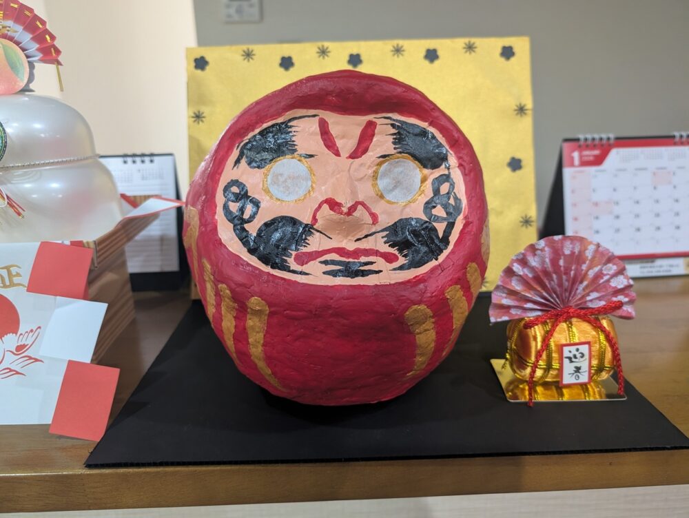 新年明けましておめでとうございます。2026年は例年になく暖かい元旦でのスタートとなりました。プレミアムハートライフ大岩では新しい一年を迎えるにあたり昨年末より無病息災の願いを込め「達磨作り」に取り組んでまいりました。元旦には完成し1F受付前に展示させていただきました。今年もご利用者様が健康で生きがいを持ち笑顔溢れる時間を過ごせるよう職員一同より一層のサービス向上に努めてまいりたいと思います。