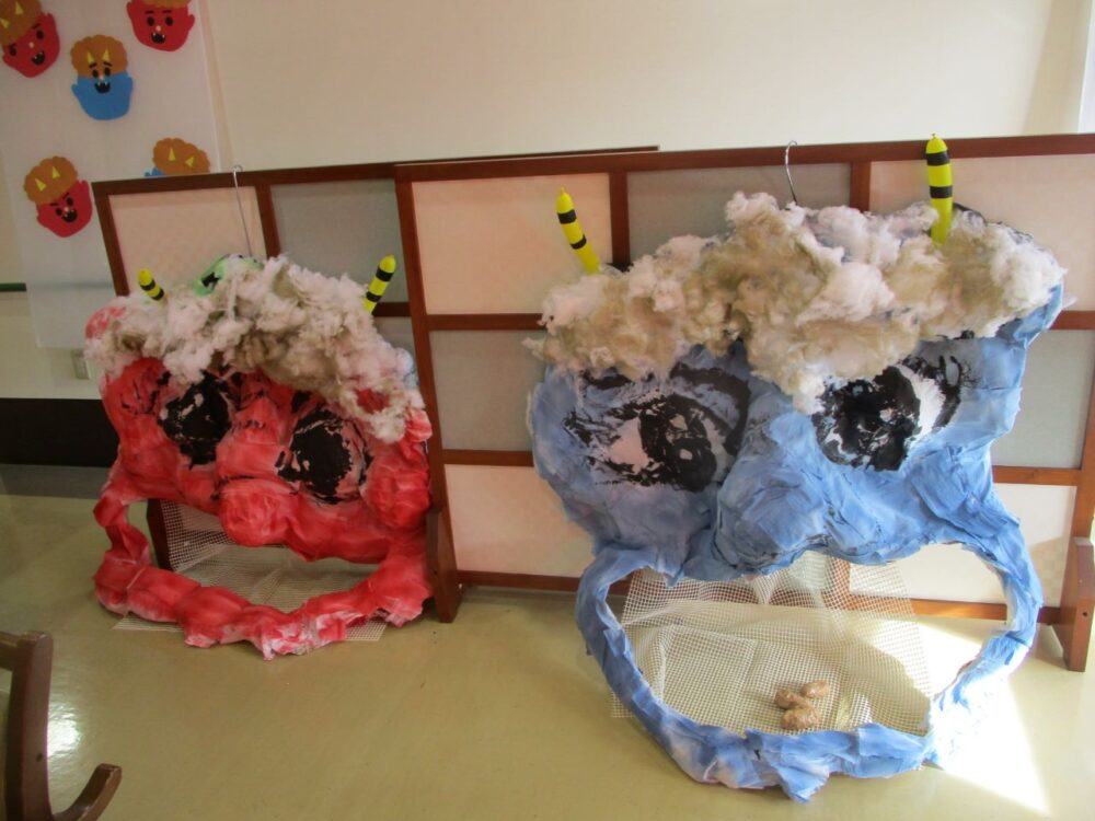 まずは、的あてです。鬼の大きなお面は、職員とお客様の手作りにより張り子で作りました。張り子とは竹や木などで組んだ枠、または粘土で作った型に紙などを張りつけ、成形する造形技法のひとつです。今回は、竹や木は使わず風船で丸い型取りをしました。