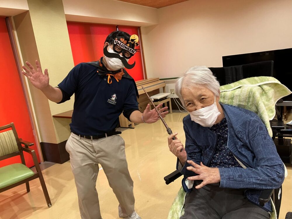 プレミアムハートライフ小鹿公園前では10月末に3階フロアにて、ハロウィンのレクリエーションを開催いたしました。当日は、職員が仮装をしてハロウィンの由来や風習をご紹介し、ご入居者の皆さまと一緒に楽しいひとときを過ごしました。中でも、職員が魔法の杖を使って披露したショーは大変ご好評をいただき、多くの笑顔が見られました。また、ハロウィンにちなんだ「かぼちゃあんパン」をご提供させていただいたところ、「とても美味しい」とのお声を多数いただきました。