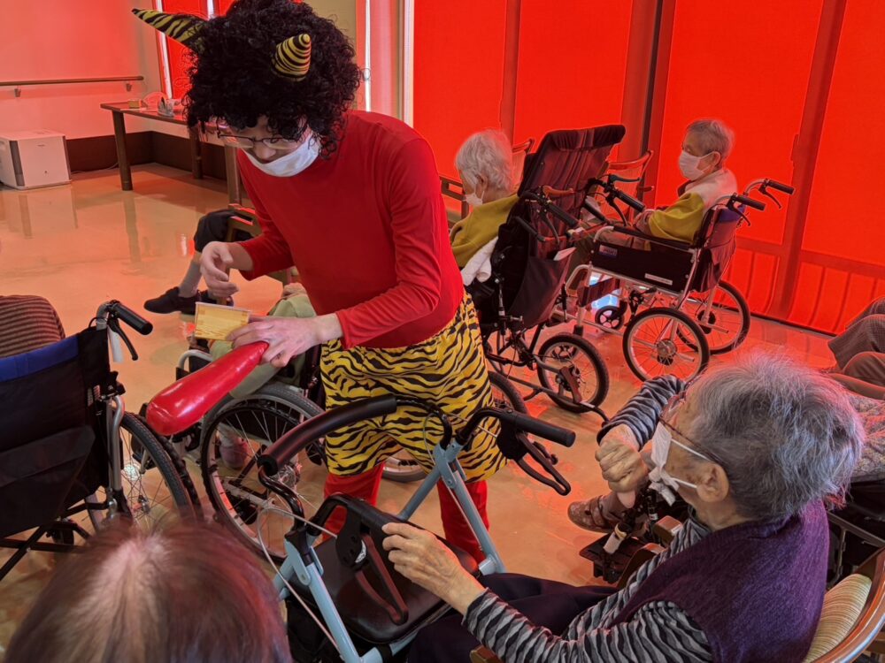 当日は、介護職員2名が赤鬼と青鬼に扮して登場。ご入居者様には、昔ながらの風習にならい、思い思いに豆をまいていただきました。力強く投げられる方、笑顔で優しく投げられる方など、それぞれのご様子が印象的でした。
